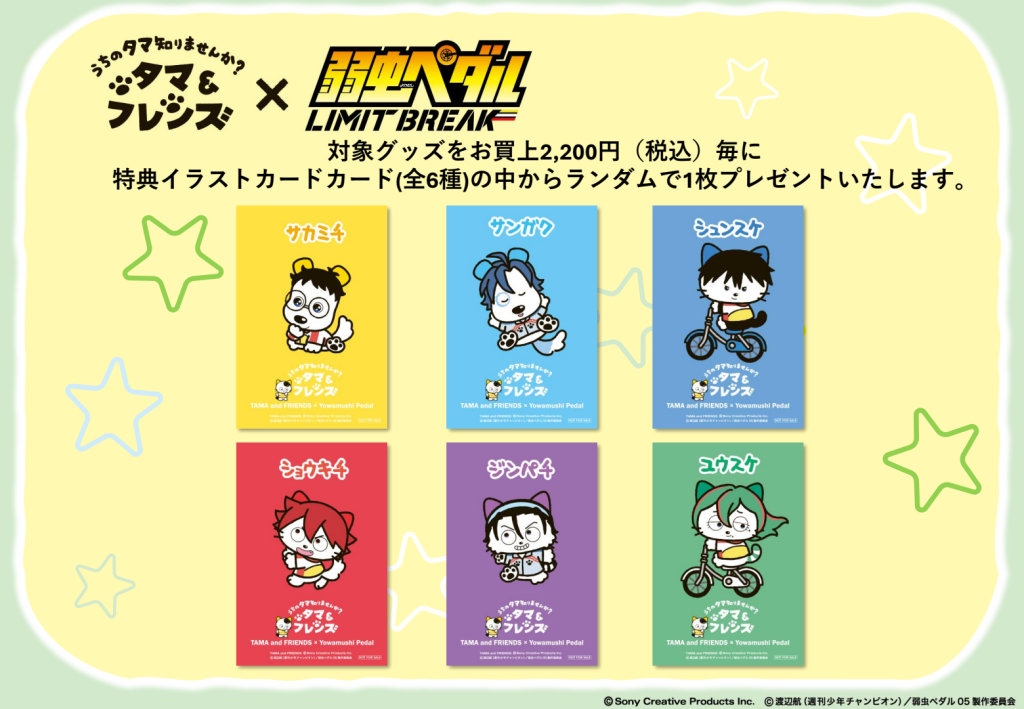 『タマ&フレンズ』×『弱虫ペダル』コラボレーショングッズをお買上2,200円(税込)毎に特典ポストカード(全6種)の中からランダムで1枚プレゼントいたします。